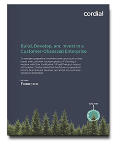 Marketing Strategy Build, develop, and invest in a customer-obsessed enterprise To remain competitive, marketers must stay true to their brand and customer value proposition. Following a webinar with Shar VanBoskirk, VP and Principal Analyst at Forrester, Cordial asked her five follow-up questions to help brands build, develop, and invest in a customer-obsessed enterprise. Key Takeaways: Learn the first step in building a customer-obsessed enterprise Discover how to advocate for customer obsession when marketing budgets are at risk Develop quantifiable goals and ways that marketing teams can test communication strategies Read the interview The world’s leading brands are driving record-breaking engagement with Cordial Future-thinking brands choose Cordial to drive record-level customer engagement and revenue growth Get a demo