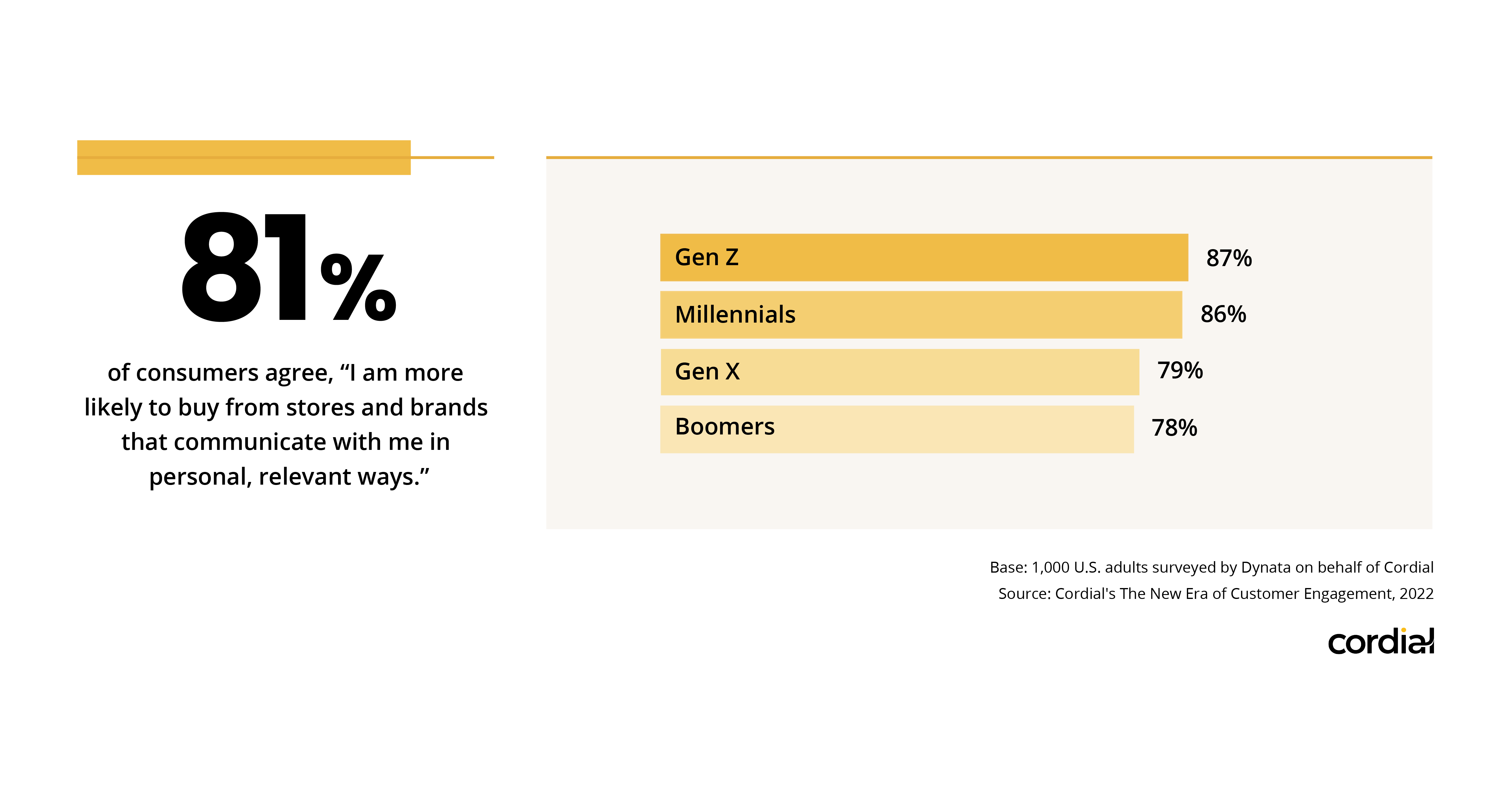 Return to All Resources 7 key insights on how consumers react to texts from brands 3 Minute Read Consumer Behavior Mobile Marketing Research & Statistics SMS Marketing Recommended for you Four signs you’ve outgrown your marketing platform Discover the untapped potential of the mobile app experience The pillars of a successful SMS marketing program CordialSend a better message. To help shine a light on what is different about brand messaging as expectations shift, we’ve conducted research on what consumers want from marketers now and how marketers can better deliver on their expectations. What we’ve uncovered can help you bridge the relevance gap and deliver the hyper-personalized communication your customers want. Although we’ve explored more than 30 data insights on brand messaging and loyalty in our recent data study, “The New Era of Customer Engagement,” here are highlights of our analysis from consumer reactions to text messages from brands—both the good and not so good for SMS marketers in our highly mobile world. Sign of brands sending better text messages Today, brands have to focus on relevance—engaging in ways that are unique to each individual. That starts by taking stock of standard marketing practices today and doing away with old playbooks. To deliver what consumers want today requires rethinking marketing approaches and reassessing what’s possible. Why? Because consumers expect more. And when you give them more, they love it! 1 in 3 people feel valued by texts from brands 1 in 5 people feel excited by texts from brands 3 in 4 people say “I like it when a brand’s email or text message helps me find something that I need, exactly when I need it.” Signs of brands sending poor text messages More than three quarters of consumers say that most of the texts they receive are generic. What’s more noteworthy is that consumers aren’t just quietly deleting the irrelevant messages—they’re tired of it. In fact, 78% of consumers say they get frustrated when brands send them generic messages that aren’t relevant to them! 1 in 5 people unsubscribe after receiving a single generic text from a brand 1 in 2 people will have unsubscribed from a brand after receiving three generic text messages 3 in 4 people say the brand texts they receive aren’t personalized to them Relevancy matters anytime, anywhere Here’s the bottom line: While brand texts can drive sales, generic messages won’t win the day and may turn customers against you. And texts need to be considered as part of the broader communication landscape, thinking about how these messages work with other channels consumers use. The sooner you embrace more advanced personalization, the bigger your impact on your customers will be. Want to learn 30 more data insights about how consumers react to brand messages? Download “The New Era of Customer Engagement” to learn how you can better deliver on rising expectations and the hyper-personalized communication your customers want. Our best content to your inbox, every month Picked For You Article Try these mobile channels to augment your email marketing strategy Email has long been the workhorse of brand marketing efforts. According to eMarketer, 80% of… Article How to nurture advocates through marketing campaigns With marketing priorities focused on KPIs, ROI, and conversion rates, it is easy to become… Future-thinking brands choose Cordial to drive record-level customer engagement and revenue growth Get a demo