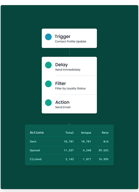 Using multiple real-time data feeds from anywhere in your business, automatically trigger messages based on changing customer behavior like interactions with in-store kiosks, website activity, mobile app interaction, message engagement, and more.