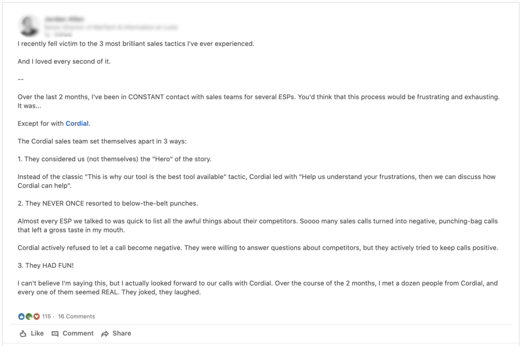 When this leading DTC deodorant brand started experiencing inefficiencies in testing, limited access to customer data, and drops in deliverability, the marketing technology team began evaluating Cordial as an alternative to their current provider. As their VP, Technology & Analytics explained, “Our previous ESP had pretty severe limitations on what, when, and where you could test. We had to do hacky workarounds to test even the most basic things, like a subject line for example.”